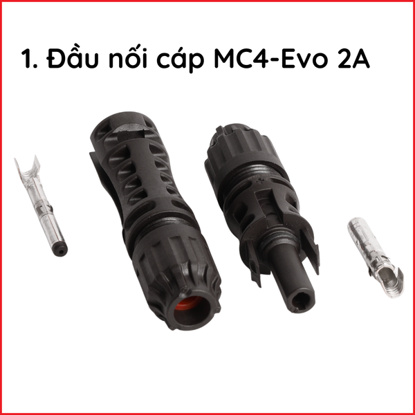 Đầu nối MC4-Evo 2A được dùng cho cáp Class 5 hoặc Class 6, gồm một cặp đầu đực và cái đạt chuẩn IEC 62852:2014+A1. Được sản xuất theo công nghệ MULTILAM, đầu nối giúp giảm điện trở tiếp xúc, hạn chế hao phí điện năng. Đặc biệt, đầu nối có độ bền cao, được công nhận chống bụi và chống nước theo các tiêu chuẩn IP65 và IP68.
